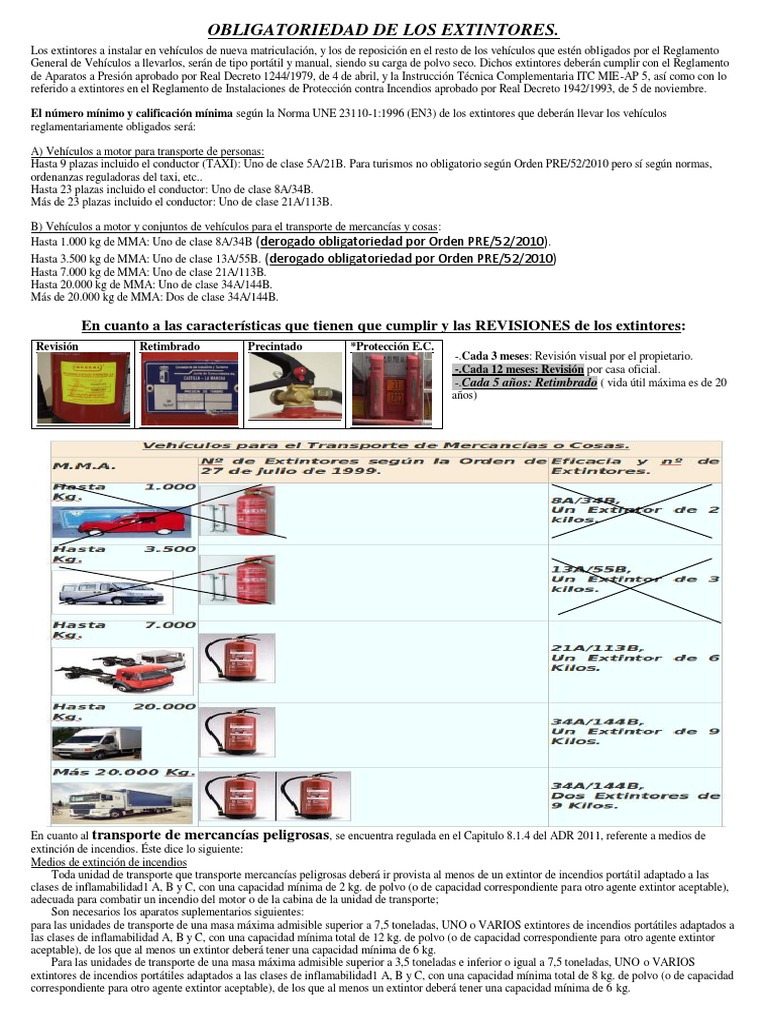 Toda unidad de transporte que transporte mercancías peligrosas deberá ir provista al menos de un extintor de incendios portátil adaptado a las clases de inflamabilidad1 A, B y C, con una capacidad mínima de 2 kg. de polvo (o de capacidad correspondiente para otro agente